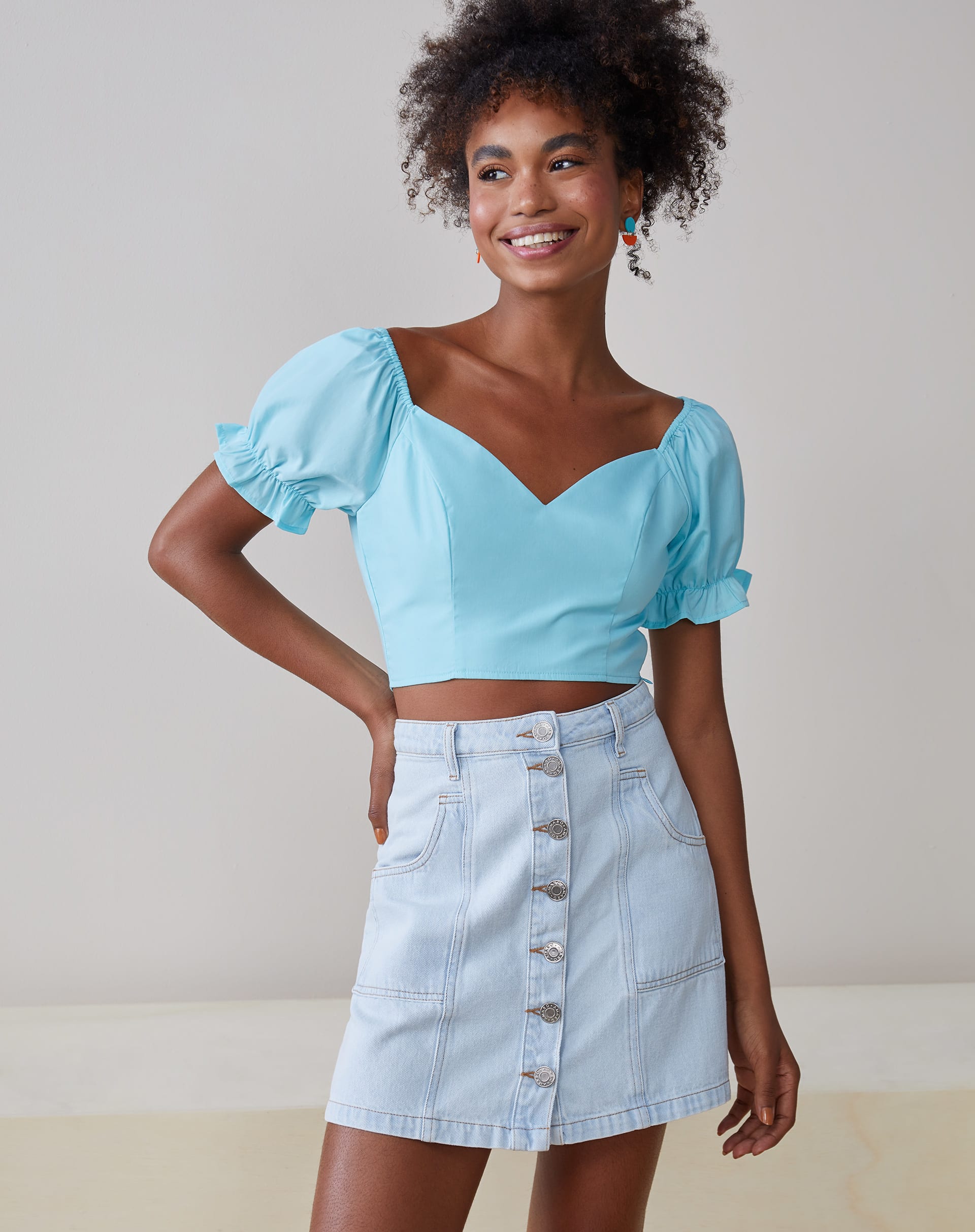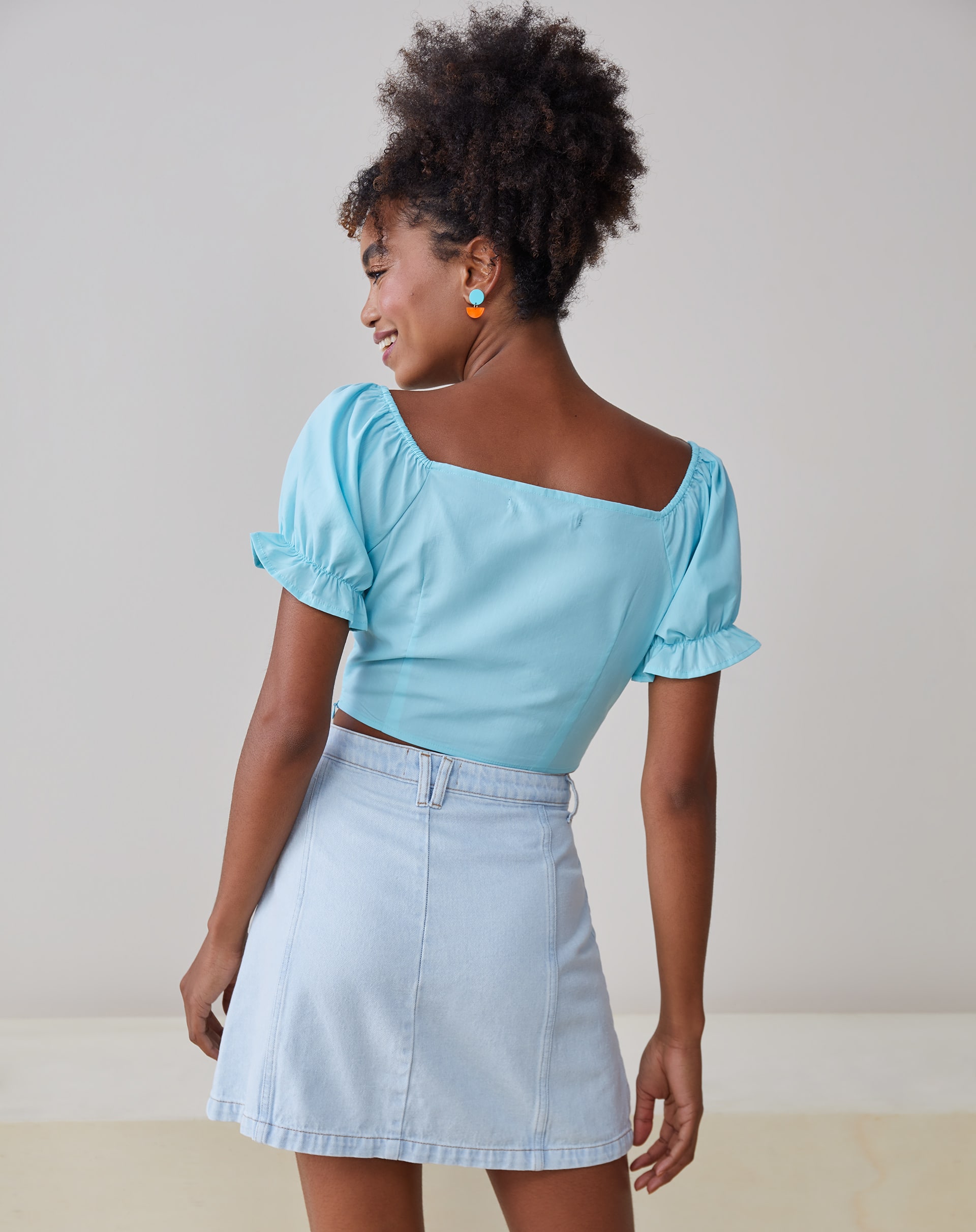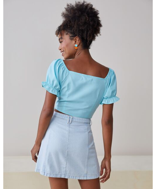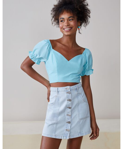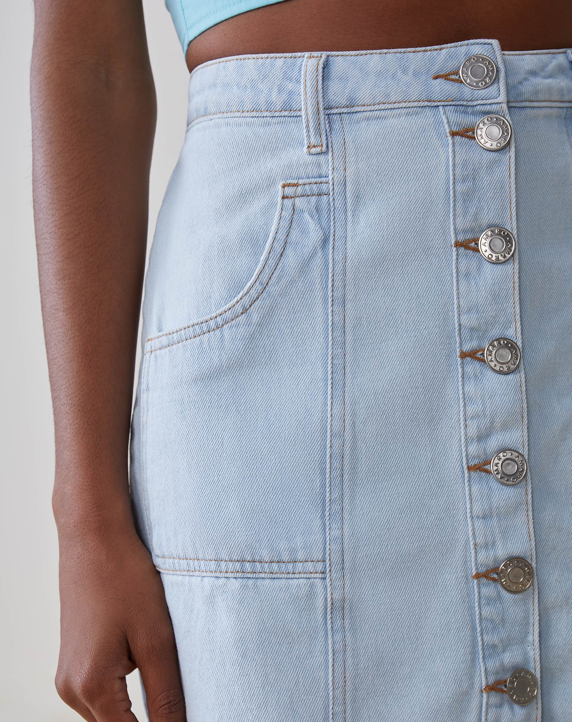 DescriçãoSAIA JEANS VISTA BOTÕES é o básico com carinha vintage que amamos. Para looks de dia ou de noite, a saia possui bolso e botões contrastantes na frente.