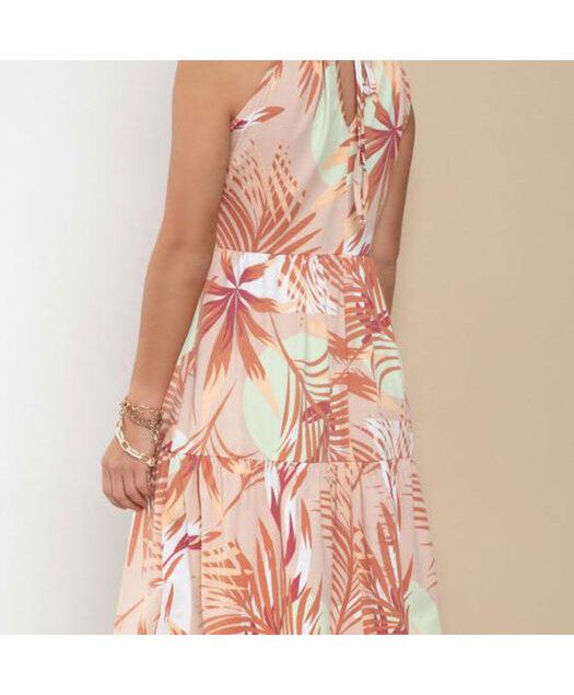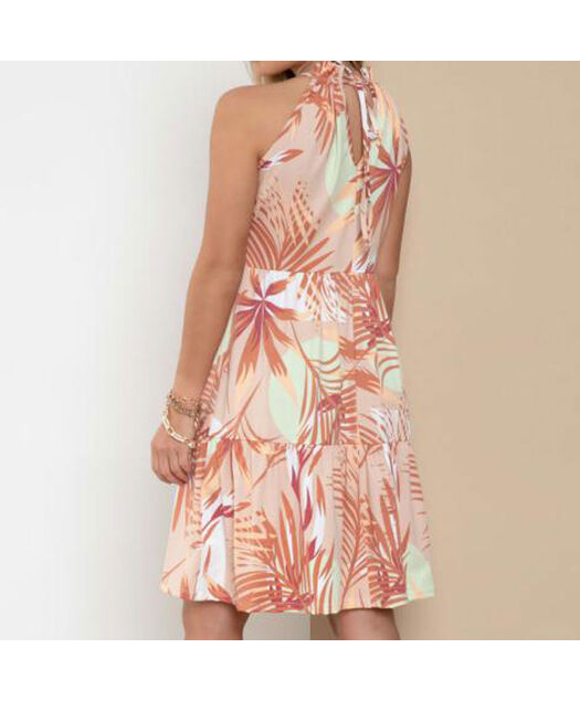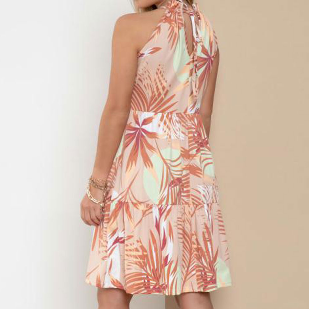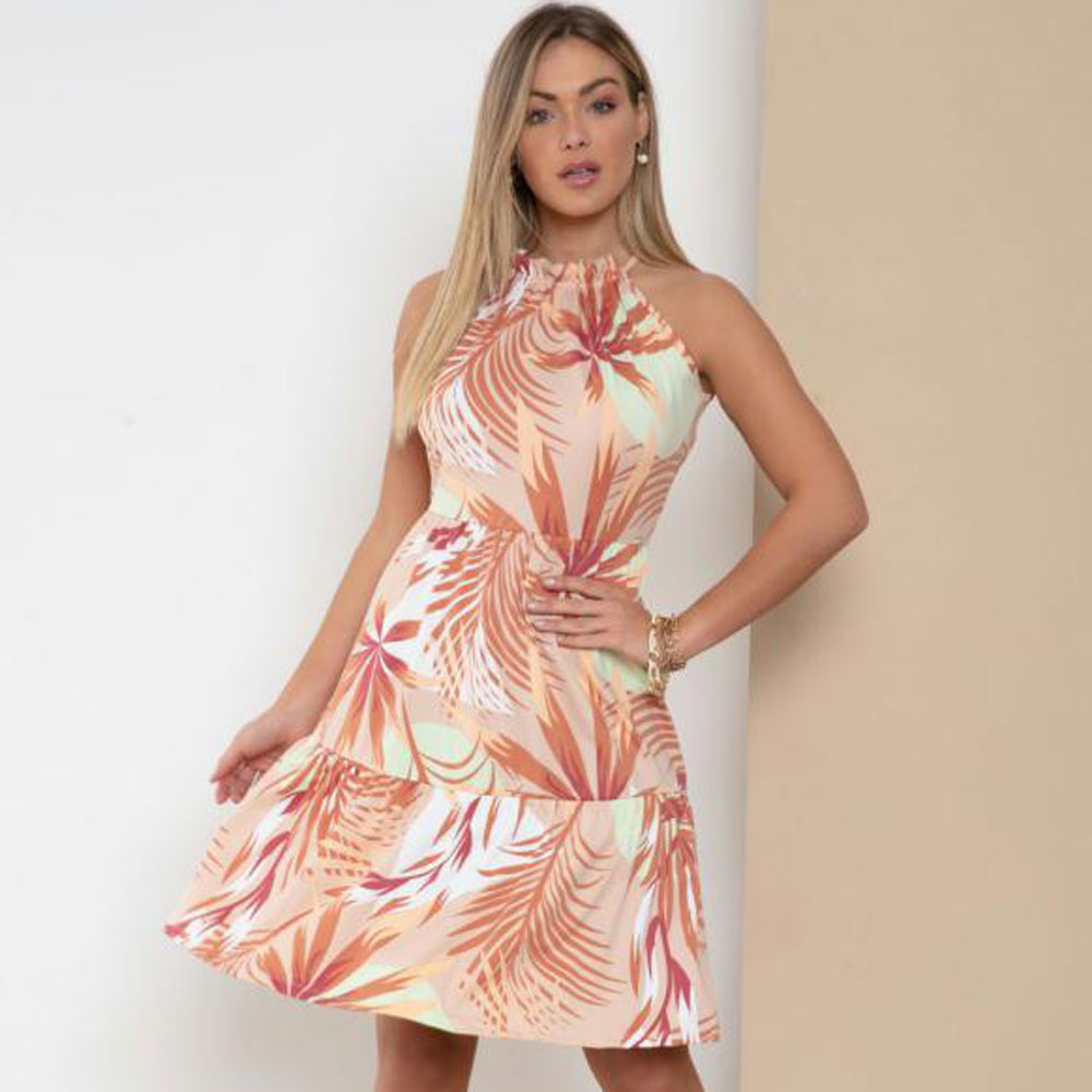 DescriçãoVestido em malha de creponada poliéster com elastano. Soltinho, alças com regulagem e decote frente em V com franzidos, barra com recorte em babados. Comprimento curto.